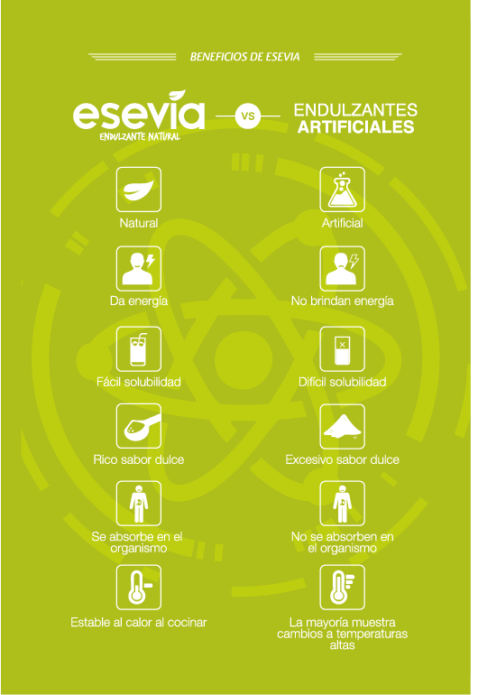 Esevia es 100% natural, no contiene químicos ni sustancias artificiales, por lo que permite tener un estilo de vida saludable y además aporta energía ya que contiene azúcar morena fortificada con vitamina A.